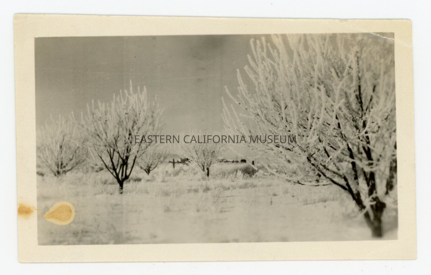 Photo of an orchard covered in snow. Location is likely Manzanar.