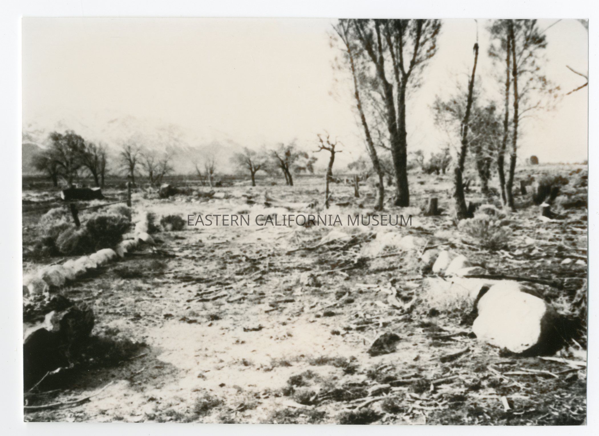 Possibly a copy of an older photo showing a rock-lined dirt road at Manzanar War Relocation Center.Photograph Details