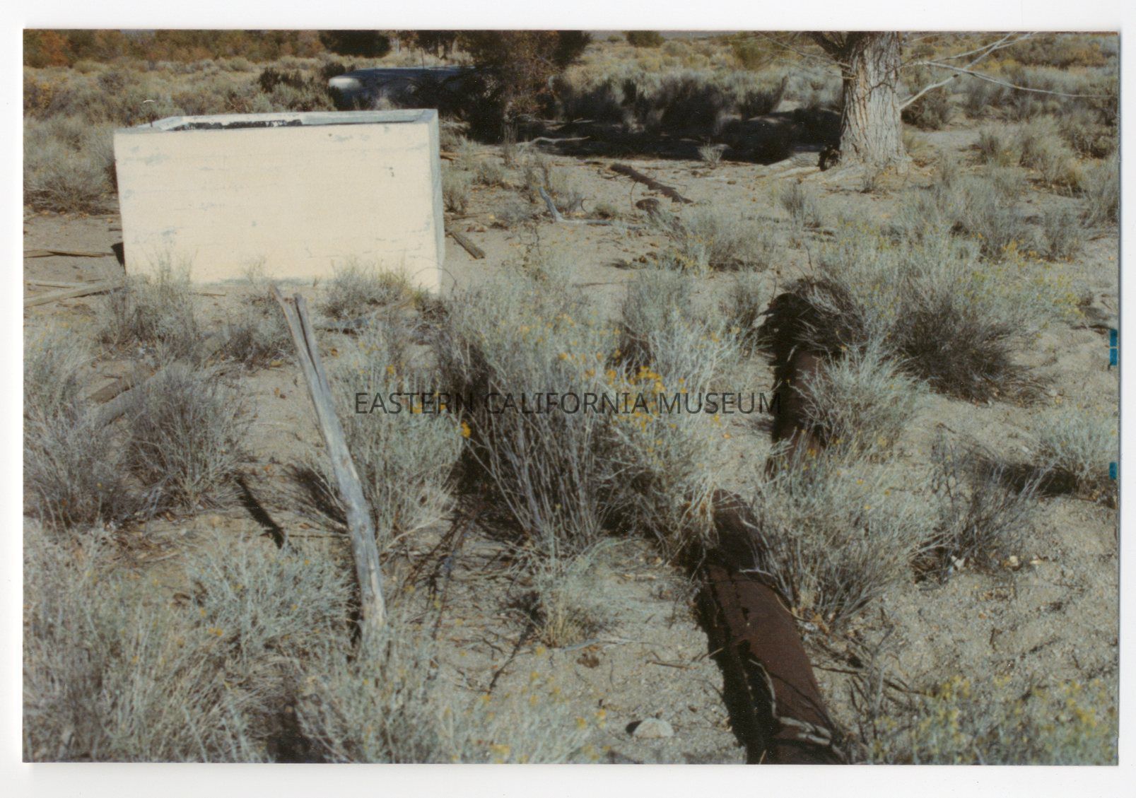 Color photo of remains of rusty pipe and concrete box at Manzanar.