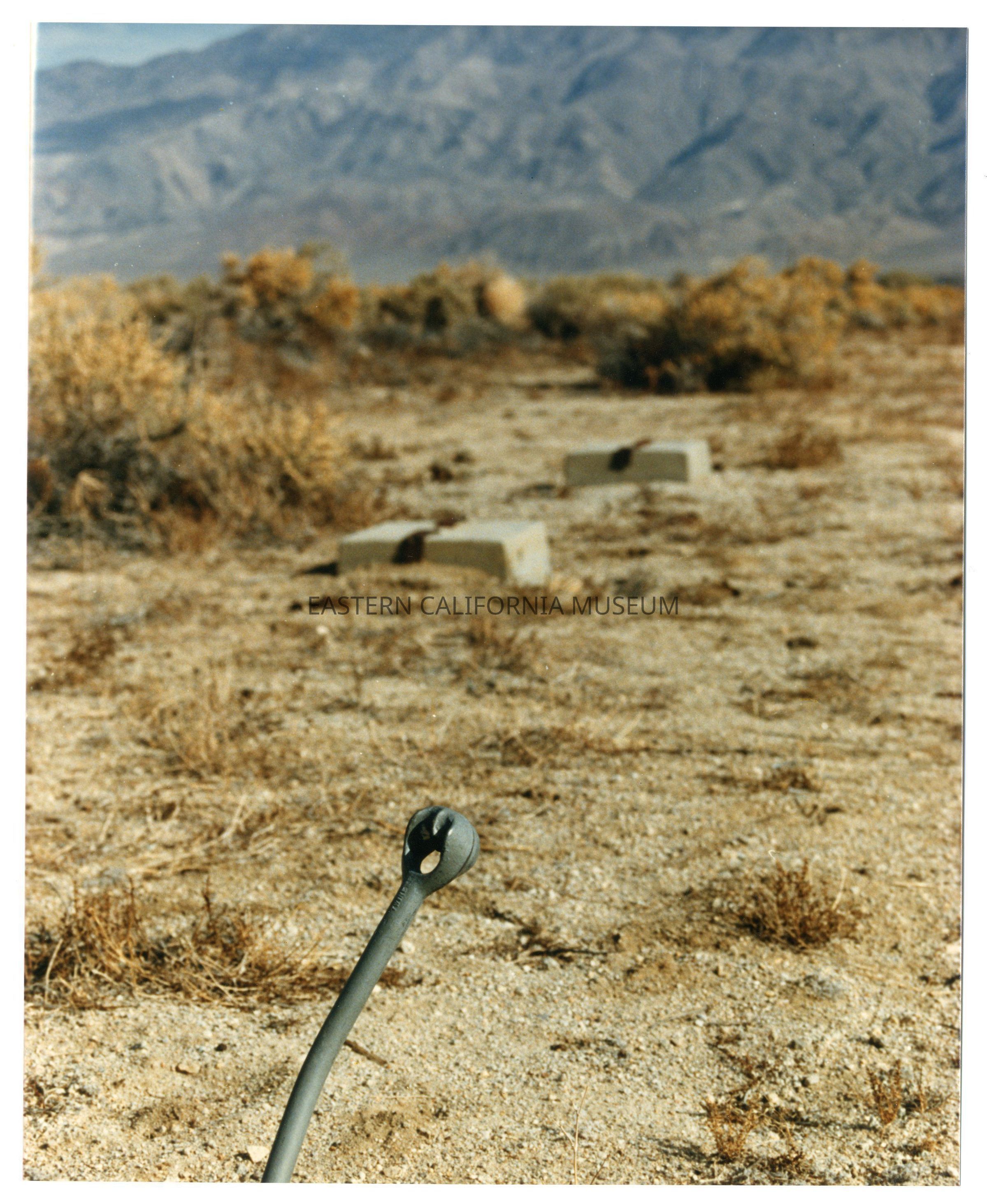 Color photo of foundations and metal at Manzanar.Photograph Details