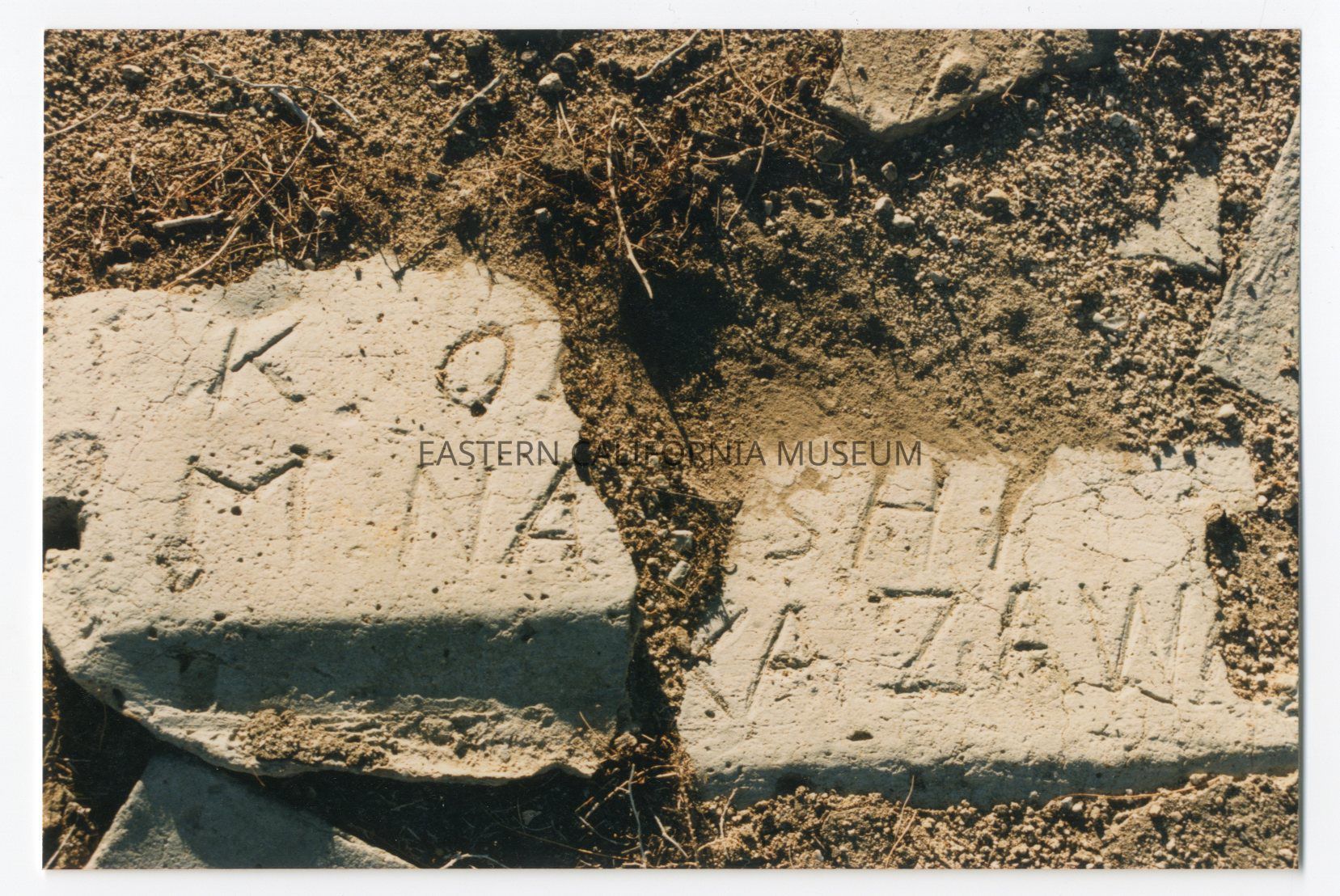 Color photo of inscriptions in concrete. This one says "K. O-- [broken off/illegible]. M. Na-shi. Kazawa- [broken off/illegible]."