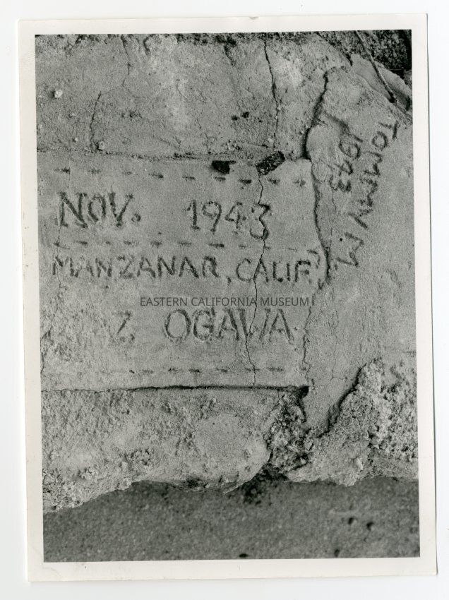 Photo of names and dates in concrete at Manzanar. They include: Nov. 1943, Mananar, Calif. Ogawa. Tommy M. 1943.Photograph Details