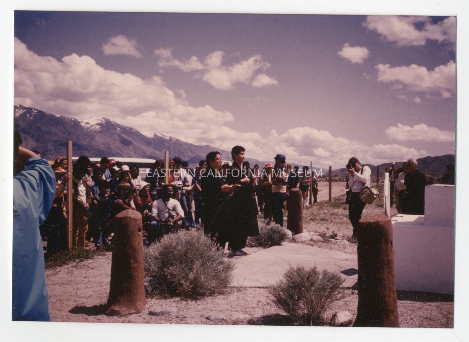 Color photo of a group of people in front of the cemetery monument at Manzanar. There are two men dressed in black in the center who appear to be leading a service of some kind. This photo was taken during a Manzanar Pilgrimage, likely in 1983. The photo was printed in March 1984.Photograph Details