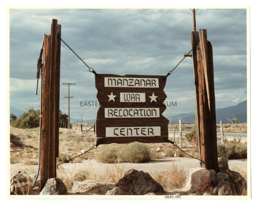 Color photograph of the recreated entrance sign for "Manzanar War Relocation Center" constructed in 1984 for a television production filmed at Manzanar by NHK TV Production, Tokyo, Japan, in April 1984. The recreated sign is in collection of Eastern California Museum, object number 1994.80.169.Photograph Details