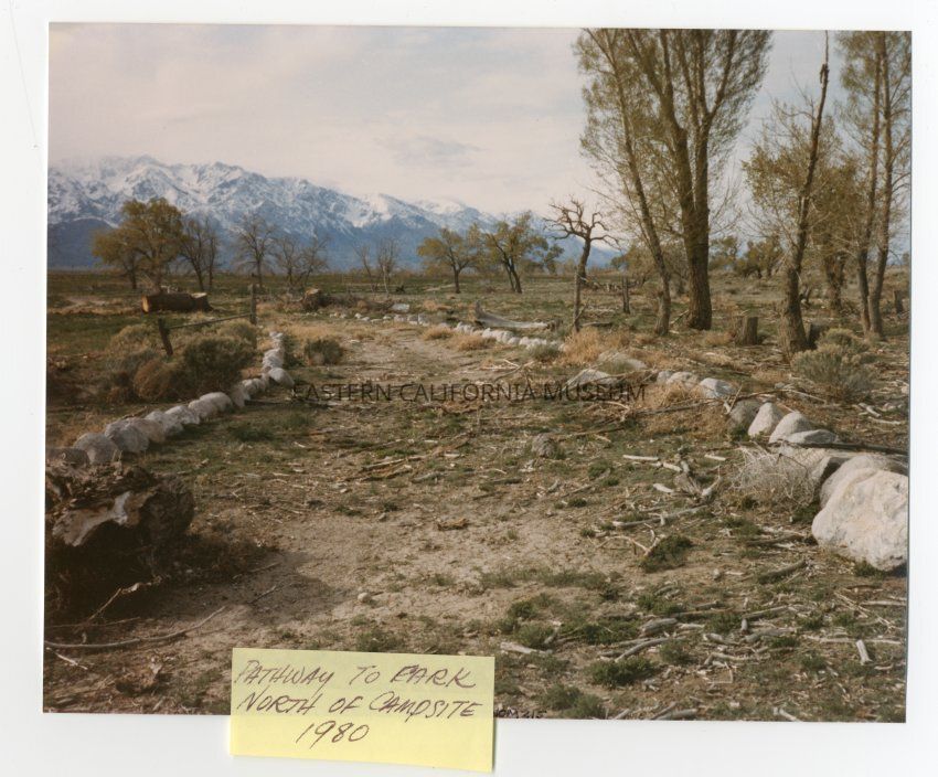Color photograph of pathway lined with rocks leading to North Park, on the site of Shepherd Ranch, north of Block 32 in Manzanar. Trees are next to the path, with the Sierra Nevada in the background. A label places this photo circa 1980.Photograph Details