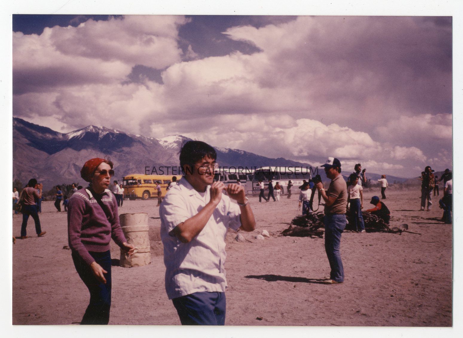 Color photo of several people milling around on a dirt lot with at least three buses parked in the background. This photo was taken during a Manzanar Pilgrimage, likely in 1983. The photo was printed in March 1984.
