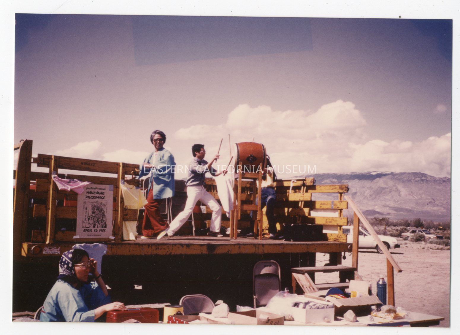 Color photo of a pair of (taiko?) drummers on a stage. There is one additional woman walking on the stage and one woman sitting down at a table in front of it. The photo was taken during the 1983 Manzanar Pilgrimage, but printed in March 1984.Photograph Details