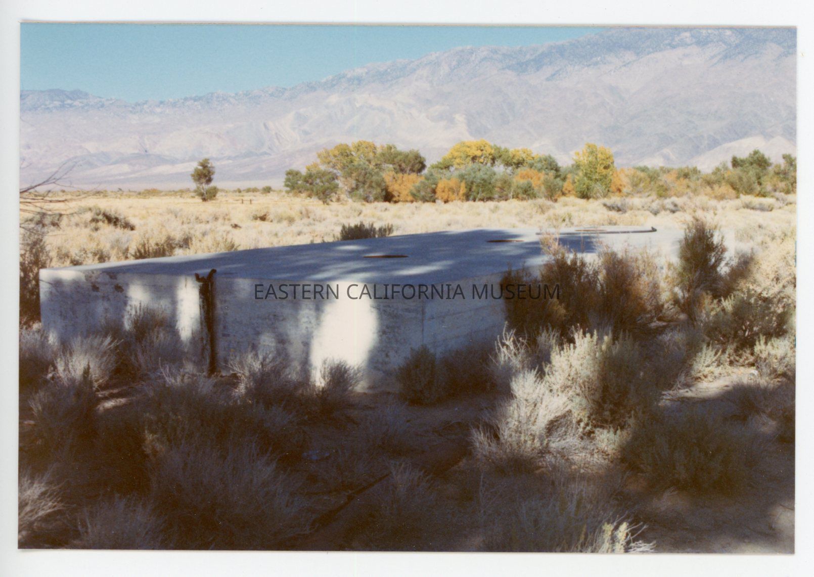 Color photo of a concrete foundation with the mountains in the background. A label with it says, "Pump houses."
