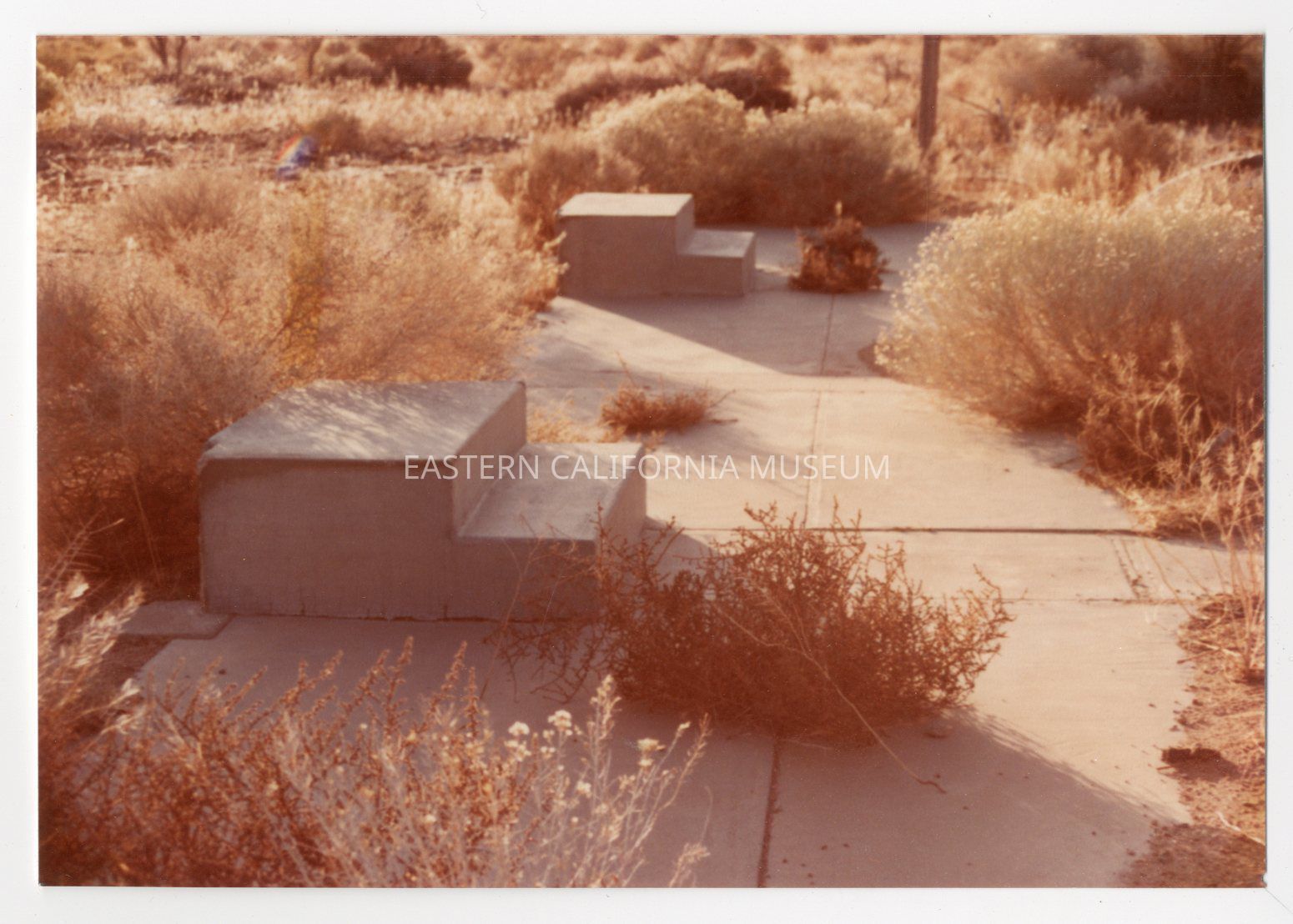 Color photo of the remains of concrete walkway and steps up to no-longer-there buildings at Manzanar.