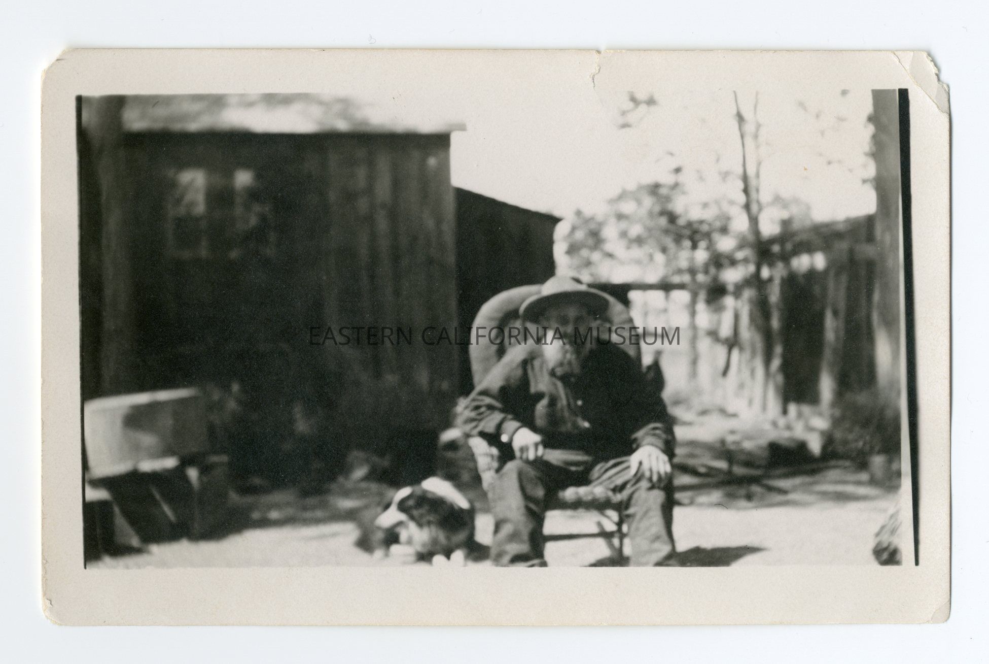 Blurry photo of a man sitting outside in a chair with a dog beside him.