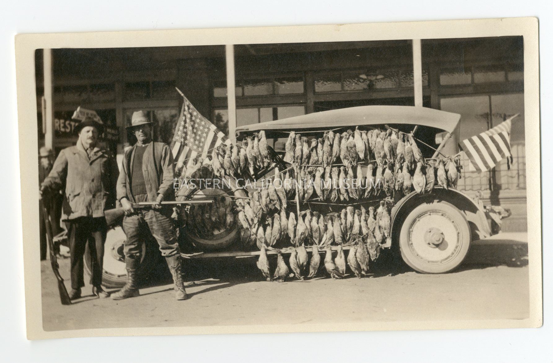 Photo of two men with shotguns standing in front of an early vehicle covered in the ducks they have hunted. There are two American flags attached to the vehicle.