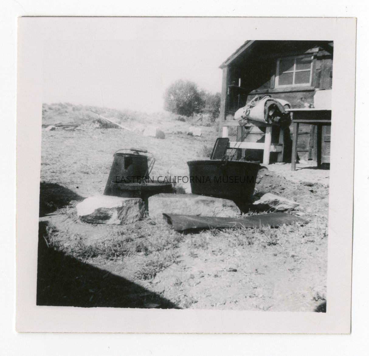 Photo of cookware (kettle, two pots) outside a cabin.