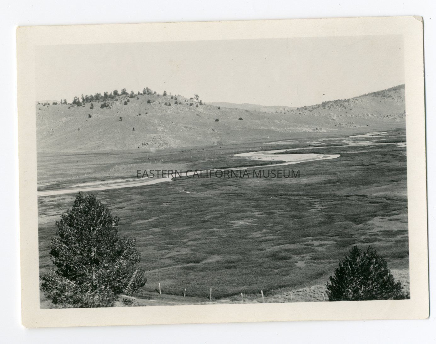 Photo of a meadow with a river meandering through it. Written in pencil on reverse: Monache Meadows. Stamped in black ink on reverse: Velvetone.