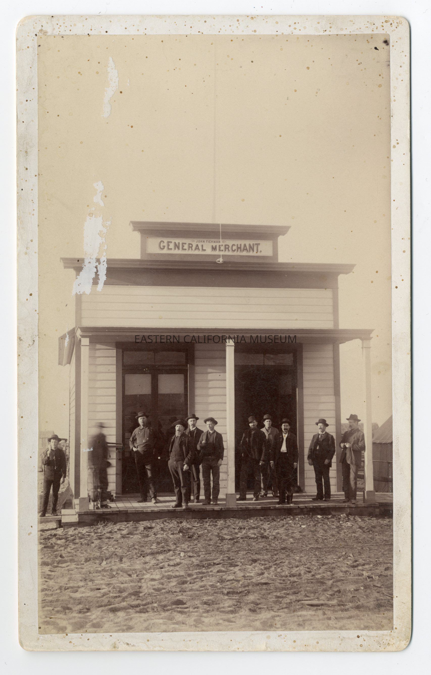 Mounted photo of a wooden store front with covered boardwalk. The sign says, "John Fichman, General Merchant." There are eleven men in the photo (one is blurry). There is a tent-like structure on the right and more buildings visible in the background.