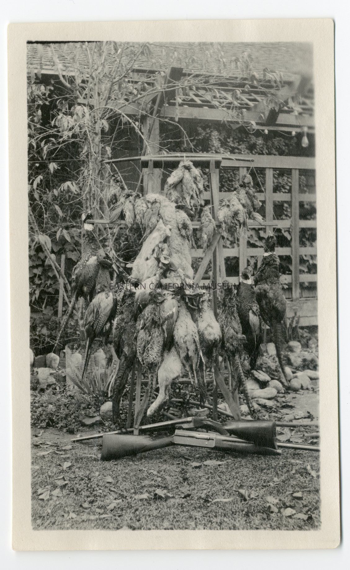 Photo of the results of a hunting trip. Two shotguns are crossed on the ground beneath a ladder or trellis on which many birds (pheasants?) and rabbits are displayed.