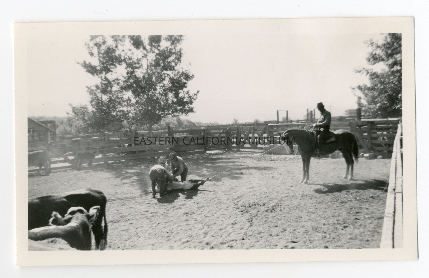 Photo of four cowboys in a corral lassoing a calf. There are a couple more cows in the corral with them.