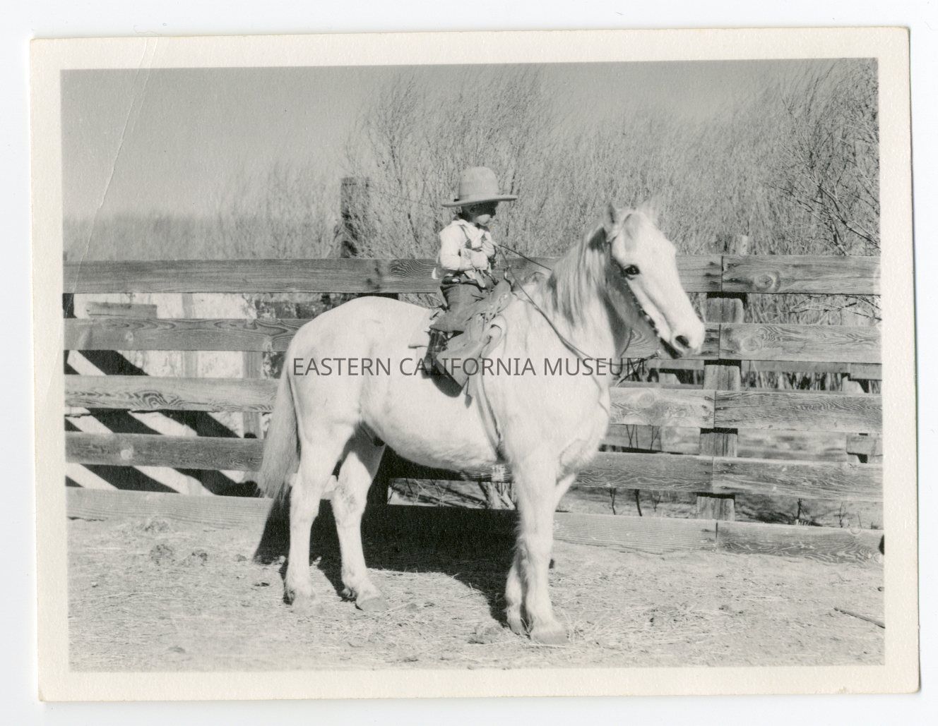 Photo of a little boy on a white horse or pony. They are in a corral. Written in pencil on reverse: Old pacer horse ("Pacey") with John, Jr. All Lacey kids learned on Pacey.