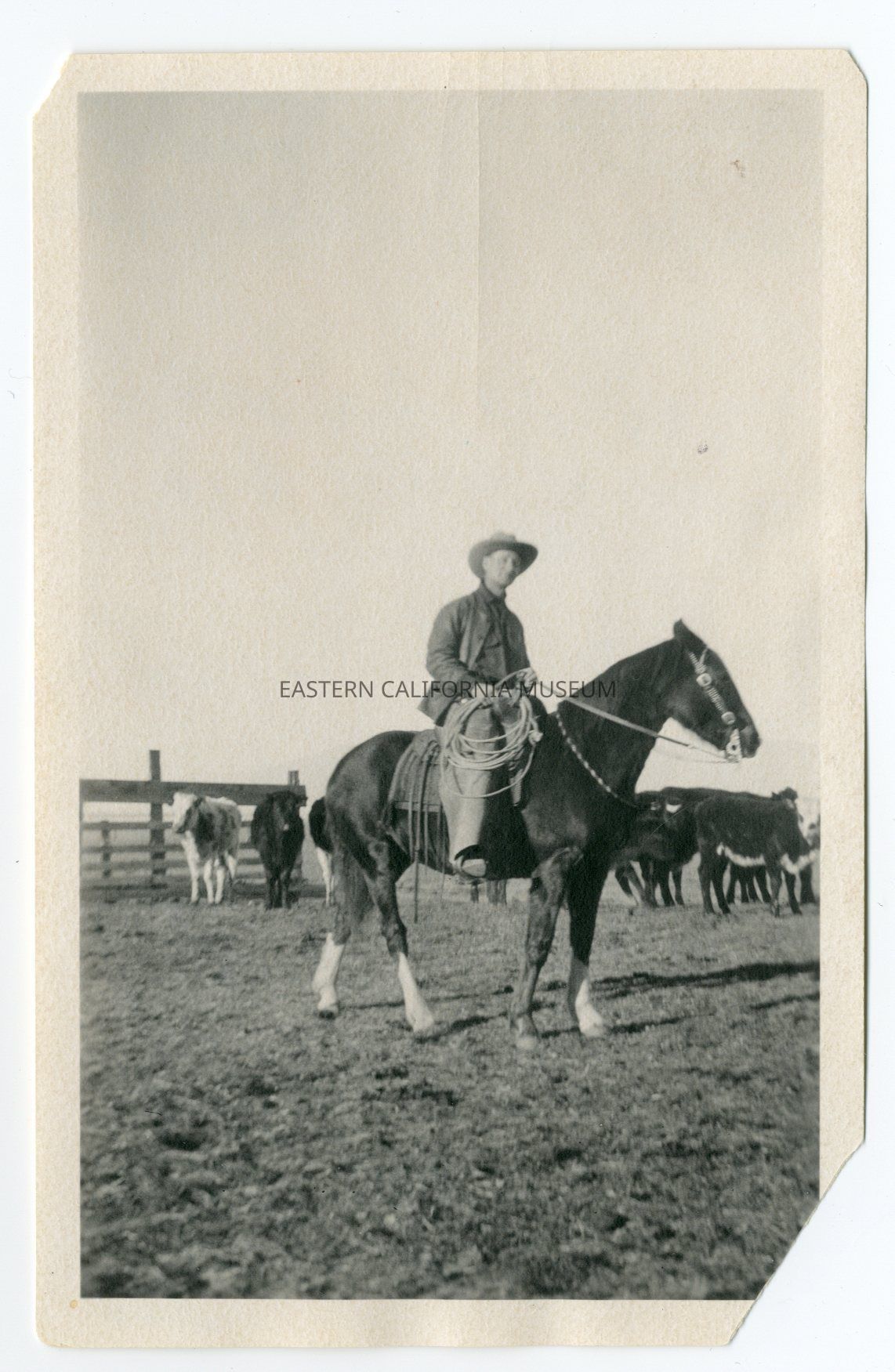 Photo of a man on horseback. There are cattle behind him and part of a fence or corral.