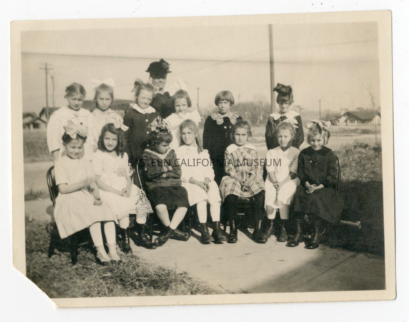 Photo of a group of thirteen young girls with an older woman (a teacher with her students?). One girl in the front row is sulking and not looking at the camera. There are houses in the background, location is unknown.