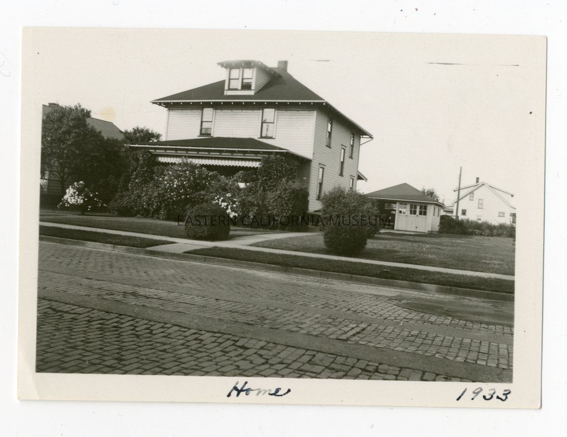Photo of a two or three story house with a detached garage. The road in front of the house is laid brick. There are other houses in the background and to the side. Written in black ink along bottom edge of photo is, "Home 1933." Location is unknown.