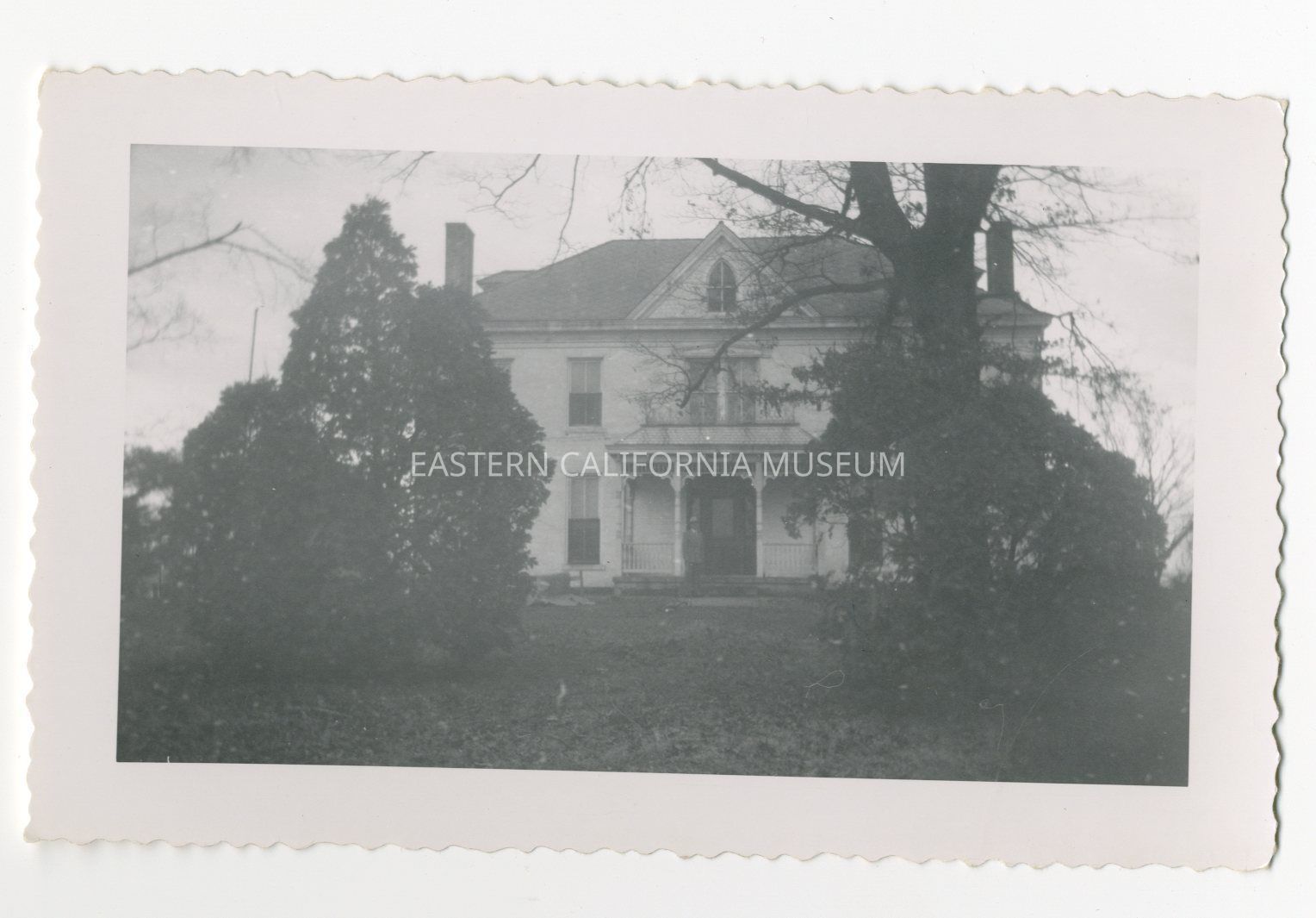 Photo of a two or three story white house with trees in front.