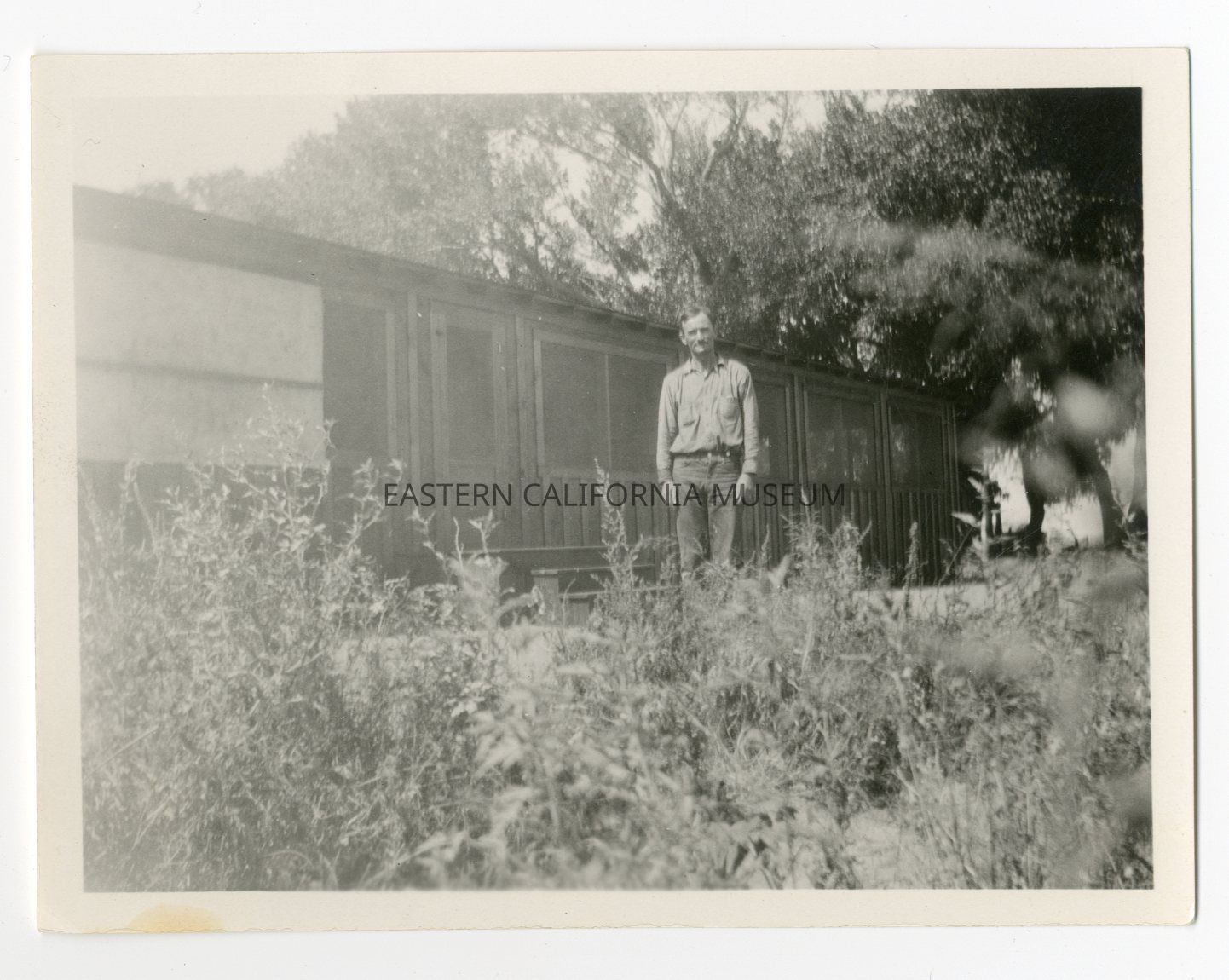 Photo of an unidentified man standing in front of a long, low building.