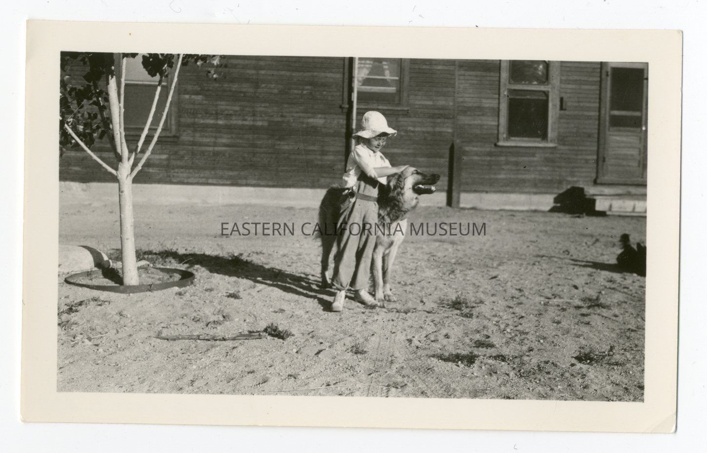 Photo of a little kid petting a dog. They are in front of a wooden building. Young tree to the left side. There appear to be tire marks in the dirt.