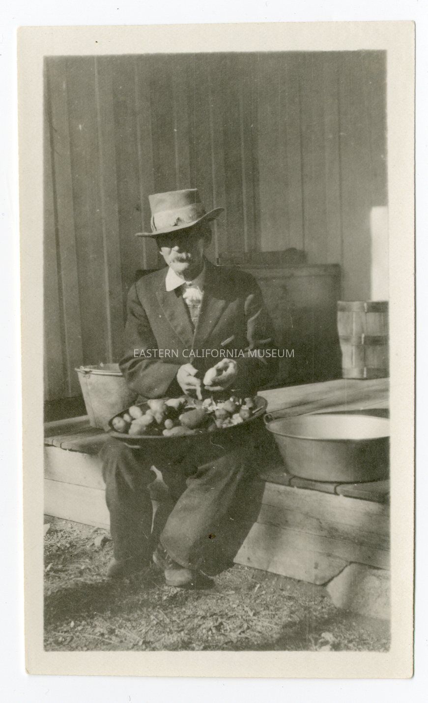 Photo of an older man sitting on a porch peeling a big bowl of potatoes. Written in pencil on reverse: Grandfather Wm. [William] Lacey.