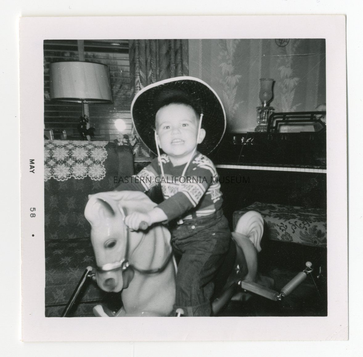 Interior photo of a little boy wearing a sombrero playing on a spring riding horse. There is a piano in the background.