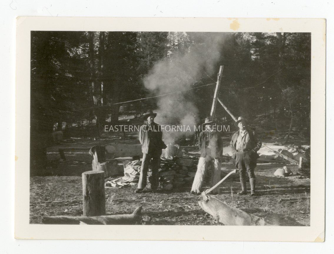 Photo of three men standing by a large stone campfire in a forest. The man in the middle is wearing light colored wooly chaps (angora?). Location unknown.