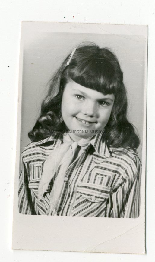 Small photo of a smiling young girl wearing a neckerchief. Written in blue ink on reverse: Gayle Dean Hart taken in the spring of 1958.
