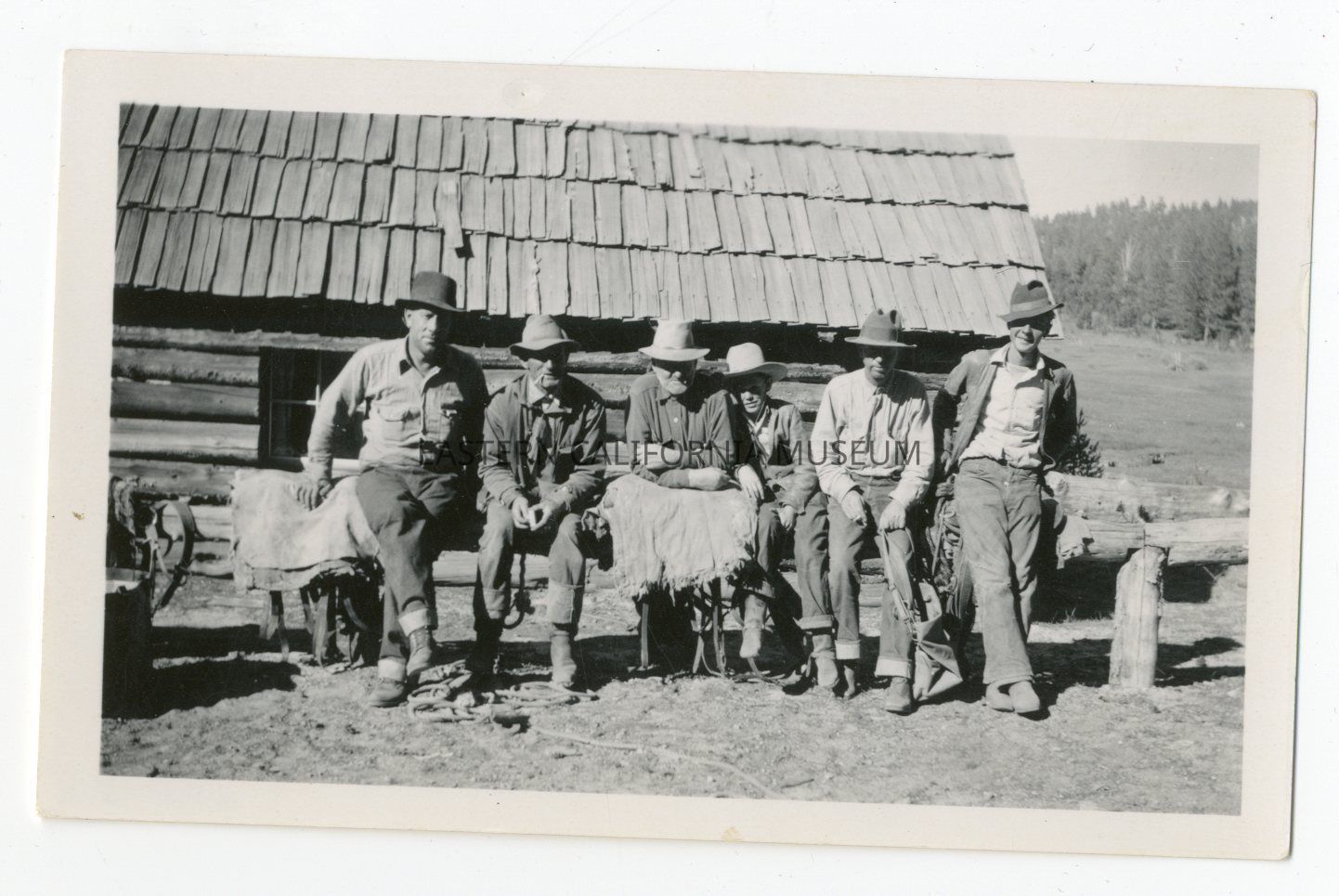 Photo of six men sitting on a log fence in front of a log cabin.