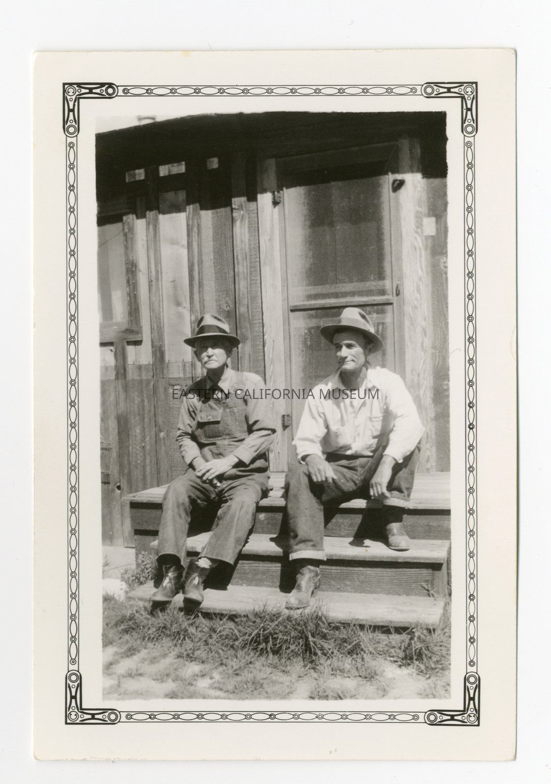 Photo of two men sitting on the steps to a wooden house or cabin. Location unknown. Written in pencil on reverse: Grandfather John William Lacey, father Mark B. Lacey. Late 30s.