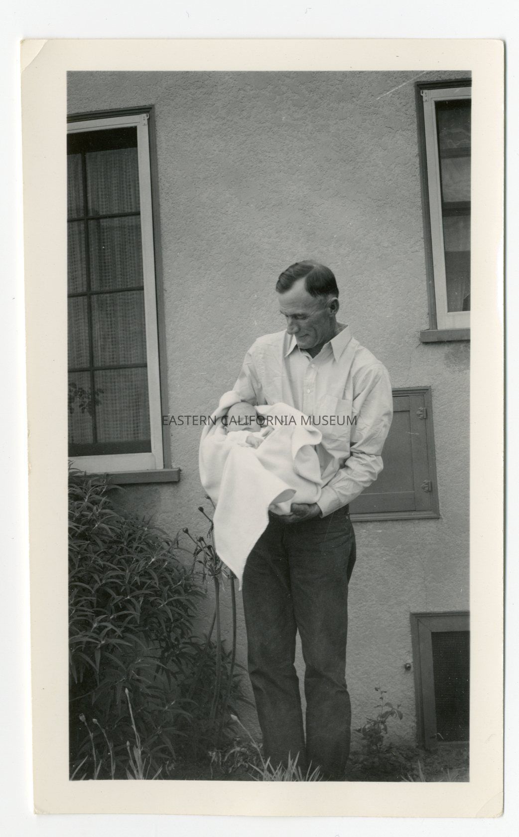 Photo of a man holding a newborn baby wrapped in a blanket. He is standing outside of a building or home.