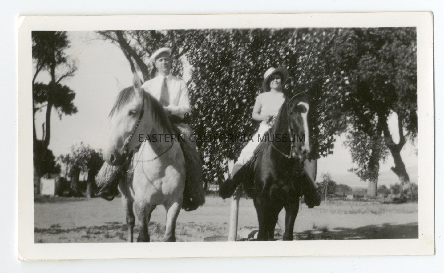 Photo of an unidentified couple on horseback. There are trees in the background. Location is unknown.