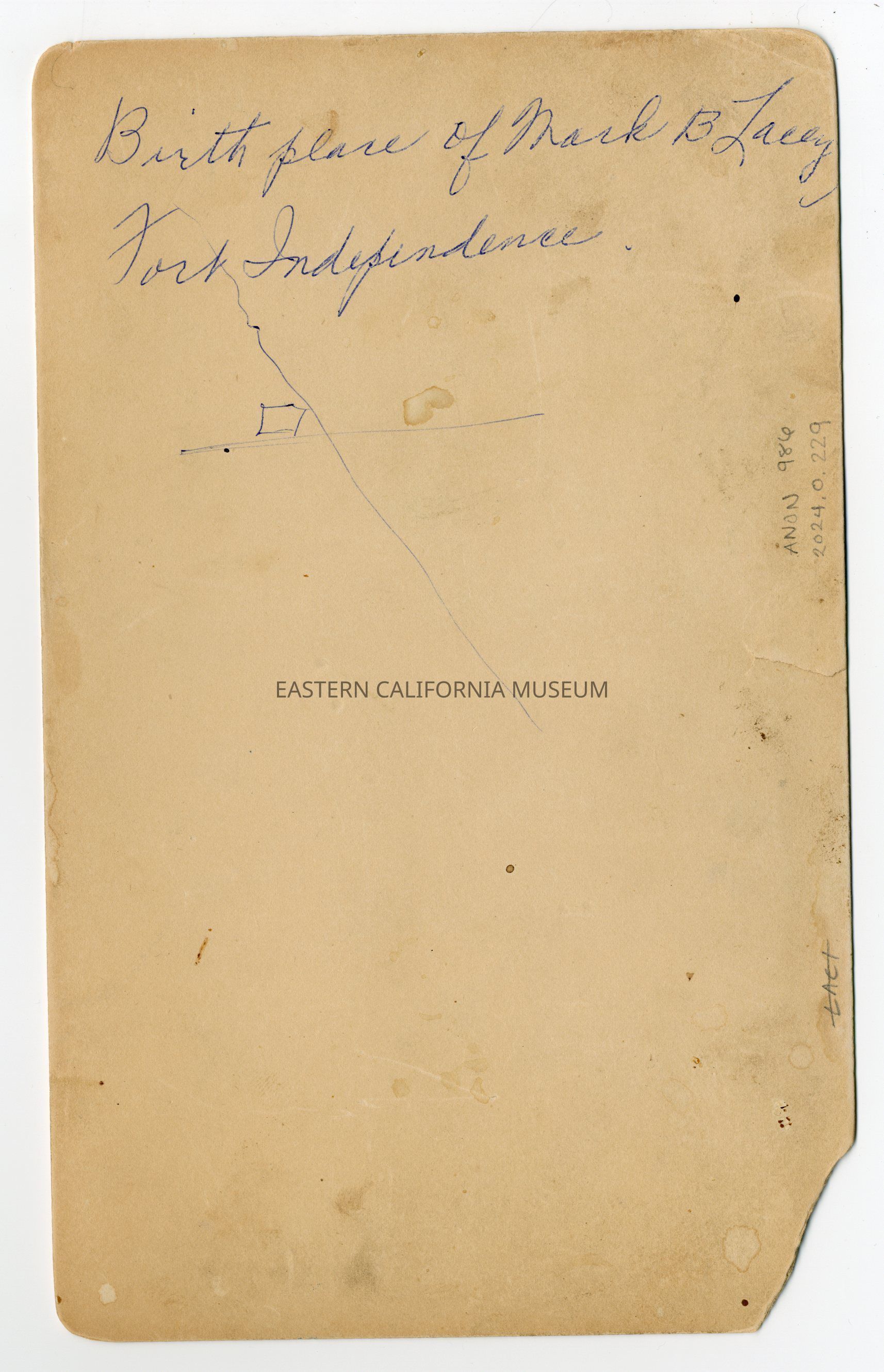 Written in blue ink on reverse: Birthplace of Mark B. Lacey, Fort Independence. [There may also be a drawing of where the house was located.]Photograph Details