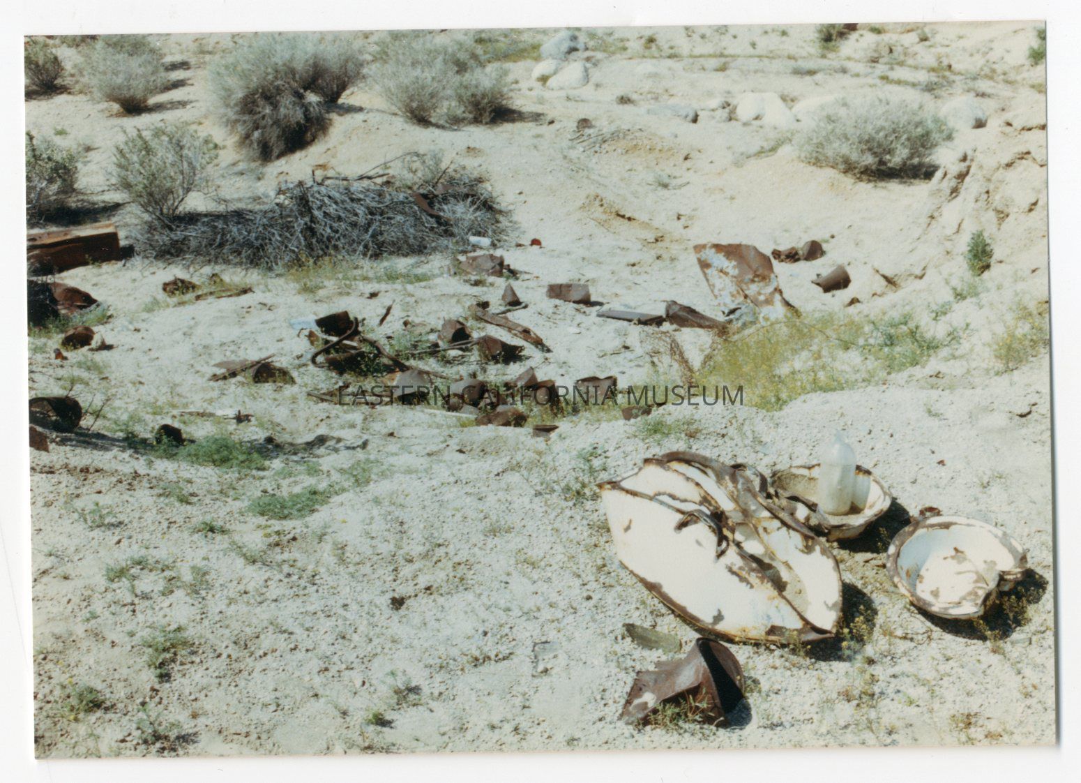 Color photo of rusty metal cans and items scattered around on the ground at Manzanar.