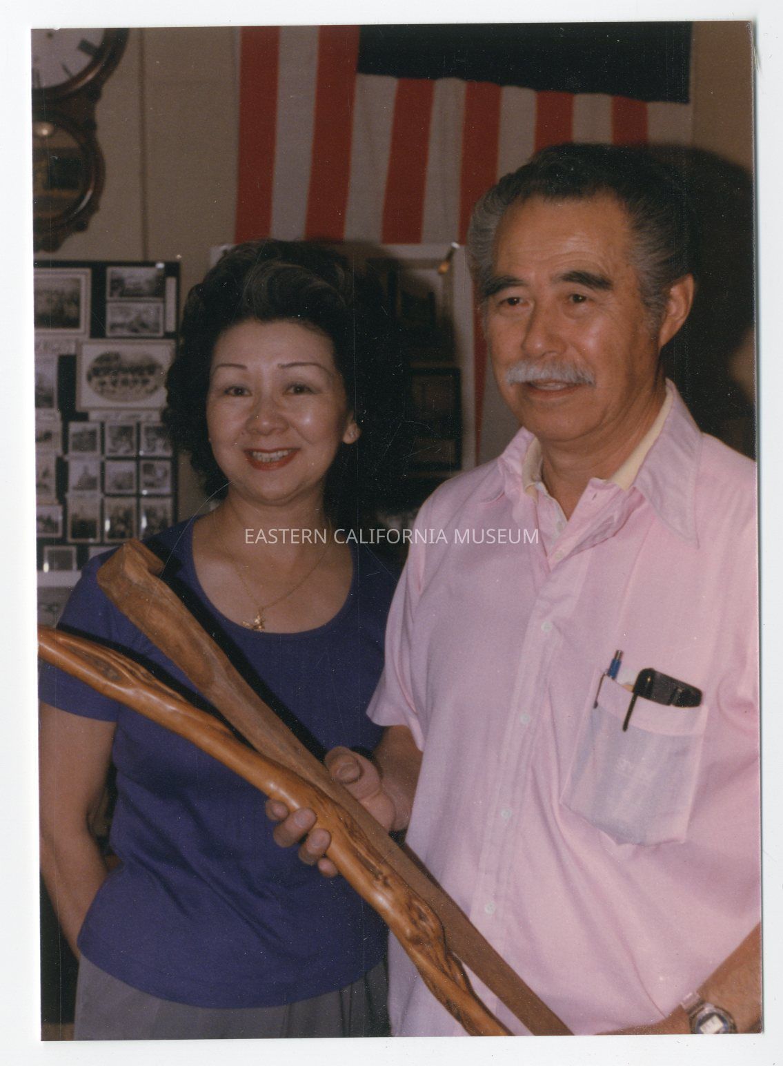 Color photo of Shi and Mary Nomura in the Eastern California Museum. Shi is holding two of the wood canes he donated to the museum and in the background are at least two of the display panels Shi made.