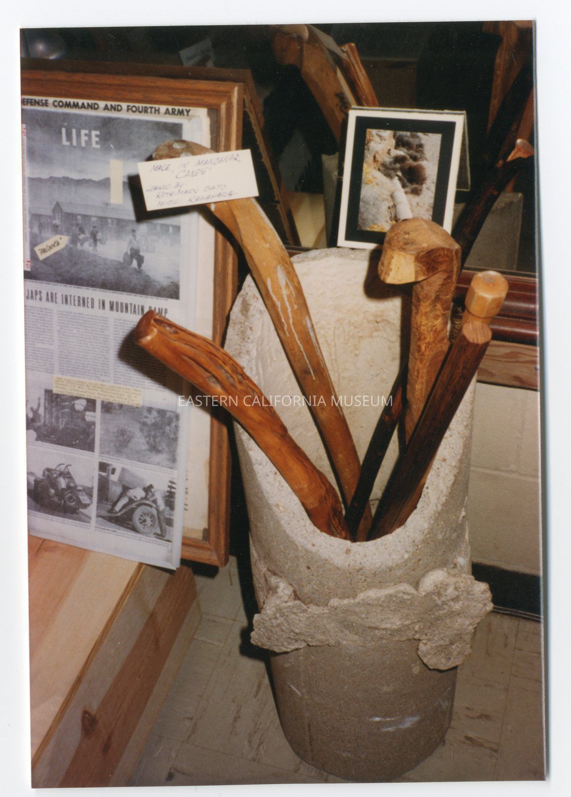Color photo of the concrete pipe (1994.80.128a) from the town of Manzanar holding several of the wooden canes Shi Nomura donated to the museum. One of Shi's display panels is visible to the left. This copy was printed in October 1985.