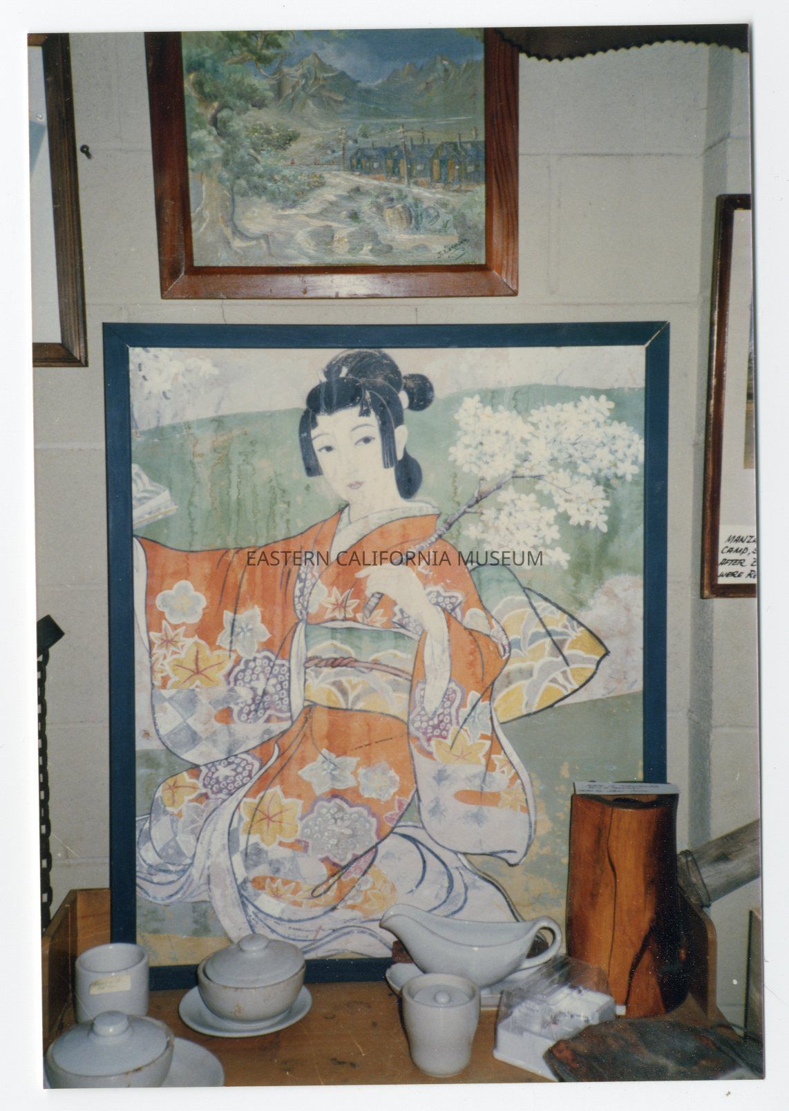 Color photo of the mural of a Japanese woman in a kimono (1968.1.1) at the museum. It was painted by Kango Takamura while at Manzanar War Relocation Center around 1942.