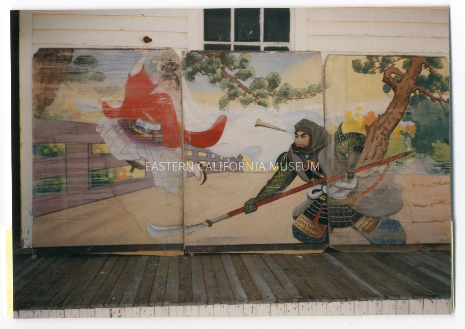 Color photo of the Ushiwakamaru and Benkei triptych mural painted by Masasuke Henry Kumano of Block 19. It was painted on the Block 16 mess hall wall and now is in the collections of the Eastern California Museum (2020.2.6-8).