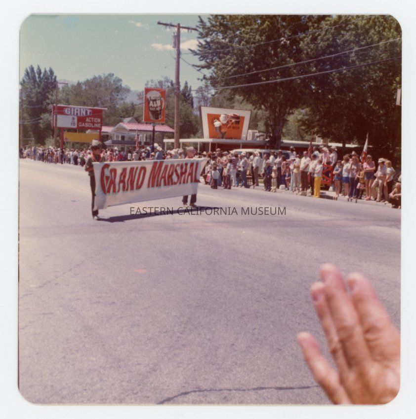 Color photo of the 1974 Mule Days Parade down Main Street in Bishop. This photo shows two people holding a banner for the Grand Marshall. Signs for Giant Action Gasoline and A&W Root Beer visible in background.Collection