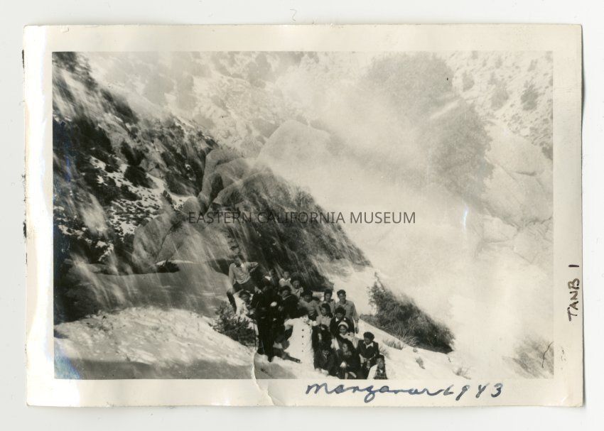 Exterior photograph of group of 15 (estimated) young men and women on a snowfield at the base of the Sierra with a snowman in middle of group. Photo is apparently a double exposure, and details are difficult to distinguish. Label next to photo describes this as a "Special picnic at the base of the Sierra's [sic]". On the bottom border of the photo is written "Manzanar 1943".Collection
