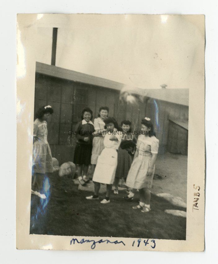 Exterior photograph of six young women standing on the grass and boulders outside of the Manzanar Hospital building. All of the women are wearing dresses or skirts and blouses. The label next to the photo says: "Manzanar Hospital Ward, Hospital Staff Women". On the bottom border of the photo is written "Manzanar 1943".Photograph Details