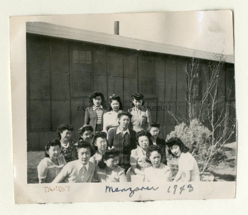 Exterior photograph of fourteen sitting and standing in three rows on the grass and boulders in front of the Manzanar Hospital building. The label next to the photo says: "Manzanar Hospital Ward, Hospital Staff Women." On the bottom border of the photo is written "Manzanar 1943."Photograph Details