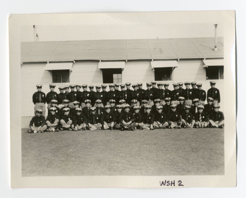 Exterior photograph of fifty-five uniformed officers of the Manzanar Police Department in three rows, with the front row seated on the ground and the back row standing. Behind the officers is the side of a building in the administration area of Manzanar.