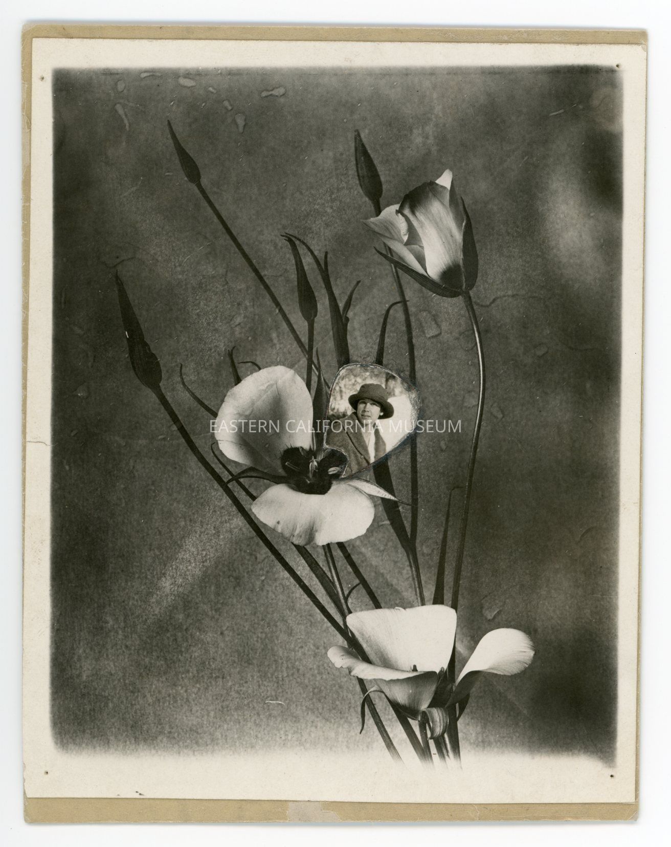 Mounted photo of flowers. A small photo of a woman (maybe Edith Mendenhall?) has been affixed to a petal of a flower.Collection