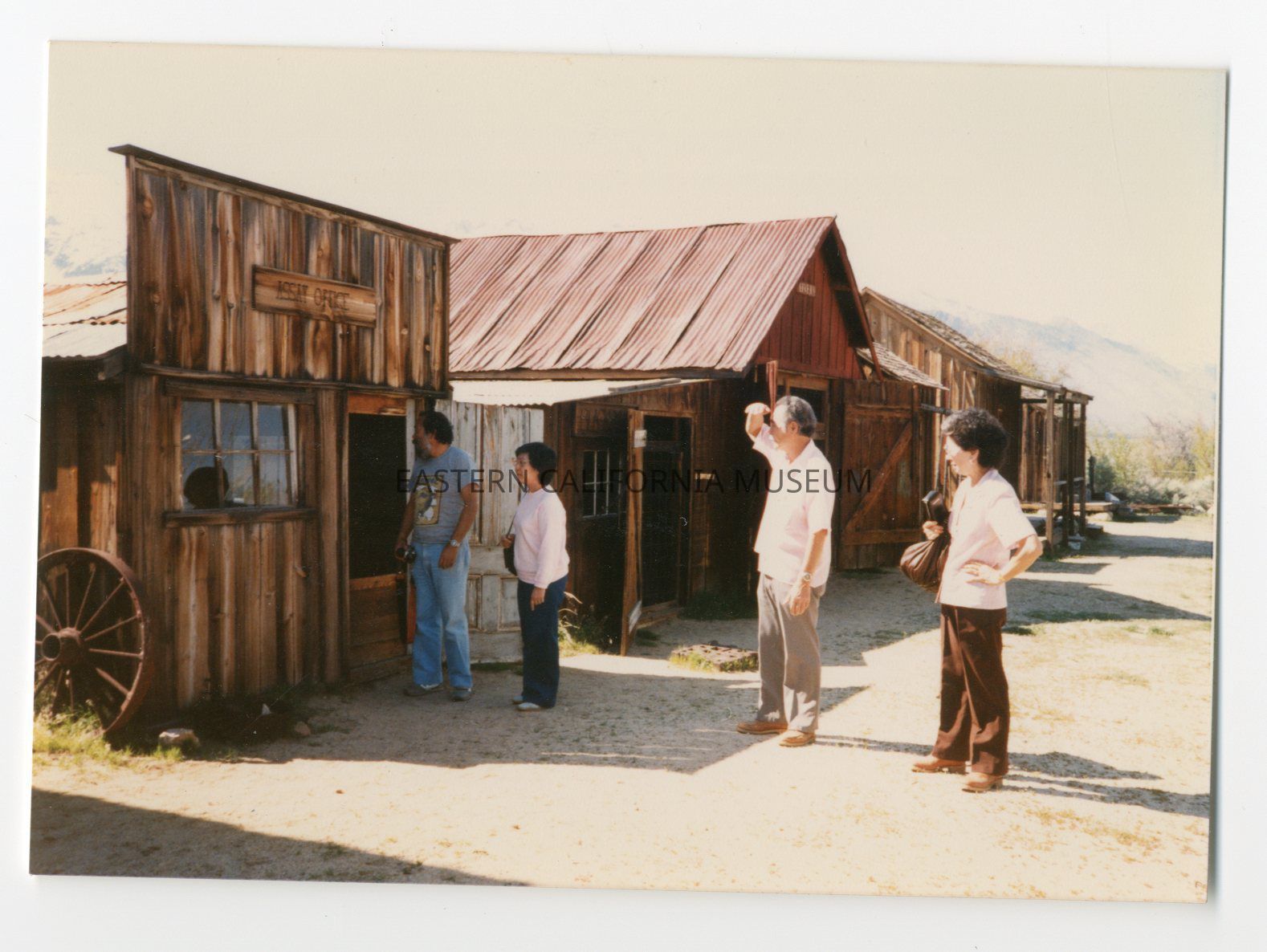 Color photo of Shi Nomura and three other people looking at the ghost town buildings on the museum grounds.Photograph Details