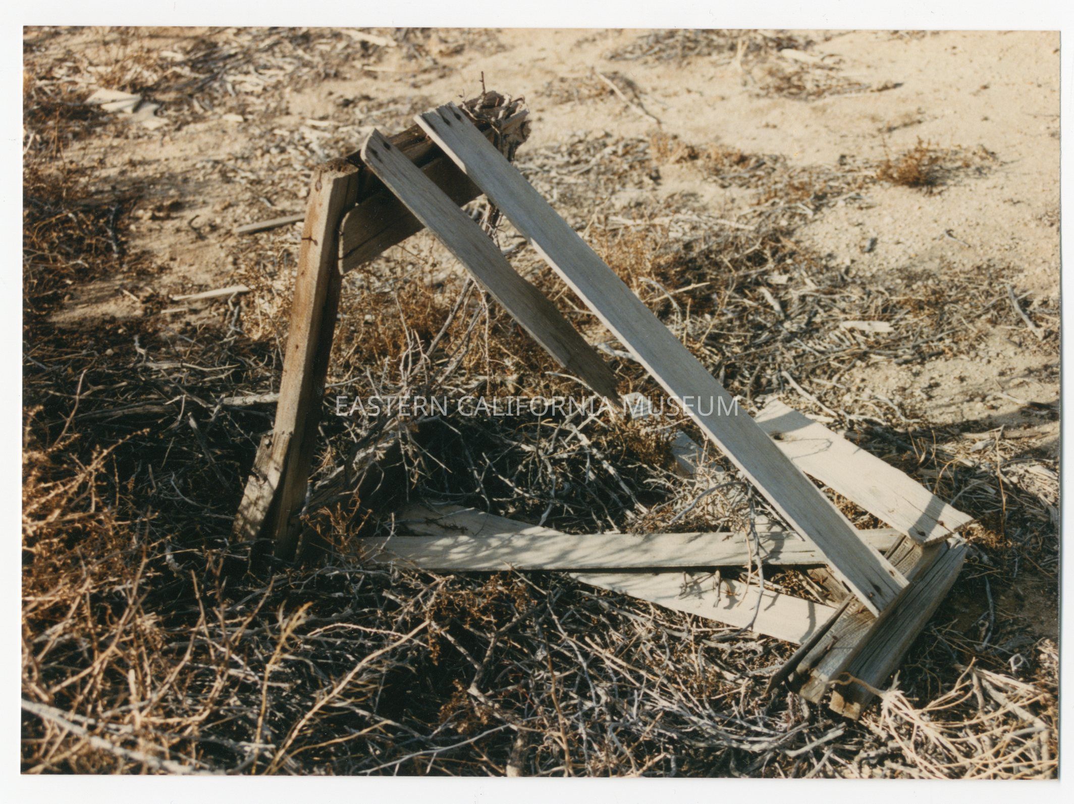 Color photo of the remains of a wooden crate at Manzanar.