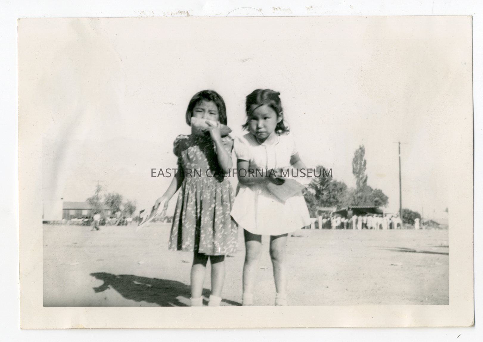 B/w photo of two little girls, one is holding something up to her mouth and the other is holding something in her hands. There appears to be a long line of people in the background.Photograph Details